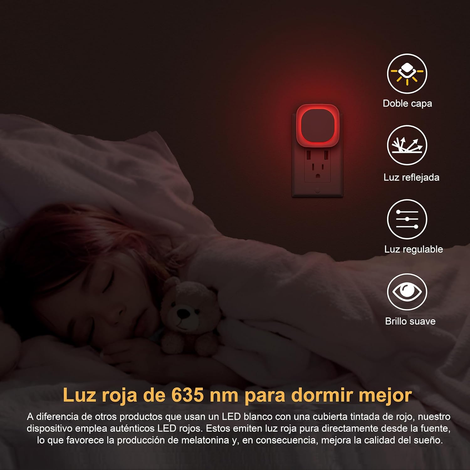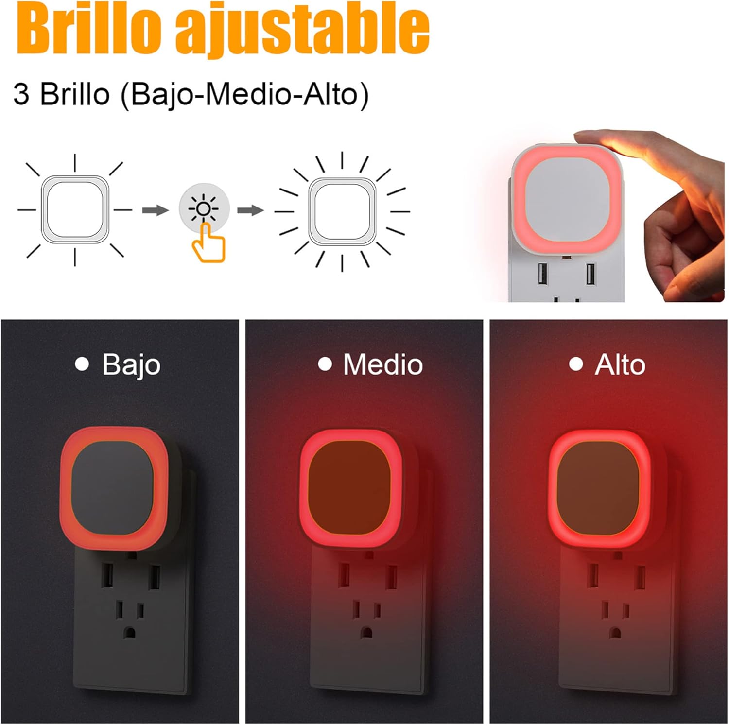 | ¿Qué habitación es adecuada? | Es muy adecuada para el garaje, la habitación de los niños, las escaleras, el salón, el dormitorio, el baño, el pasillo o la cocina, ya que la luminosidad es regulable. Gracias a su diseño estrecho y plano, no sobresale demasiado del enchufe y no choca con nada al pasar. |